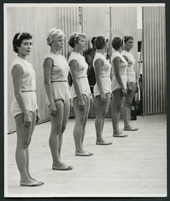 Bilden föreställer sex gymnastklädda flickor. Flickorna står på rad i ett öppet rum.