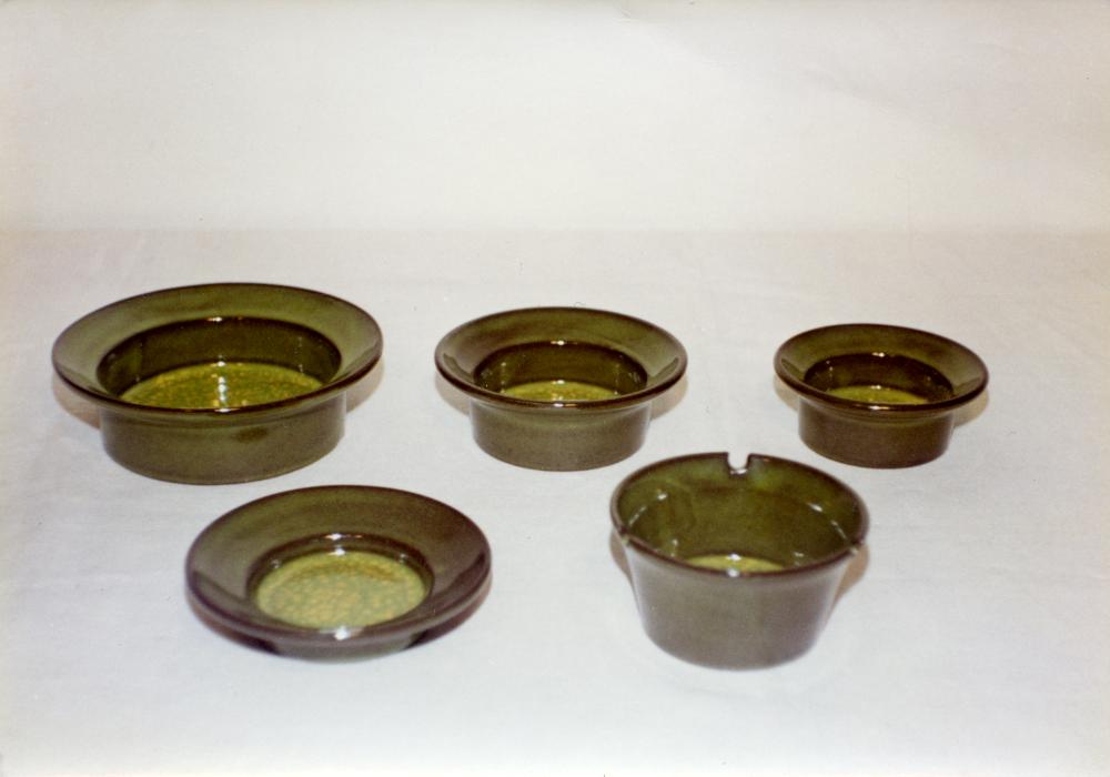 Färgfotografi föreställande 5 skålar/tallrikar i keramik. På baksidan står det noterat med blyerts: Solveig. Ev. formgivna av Solveig Ueltzhöfer
