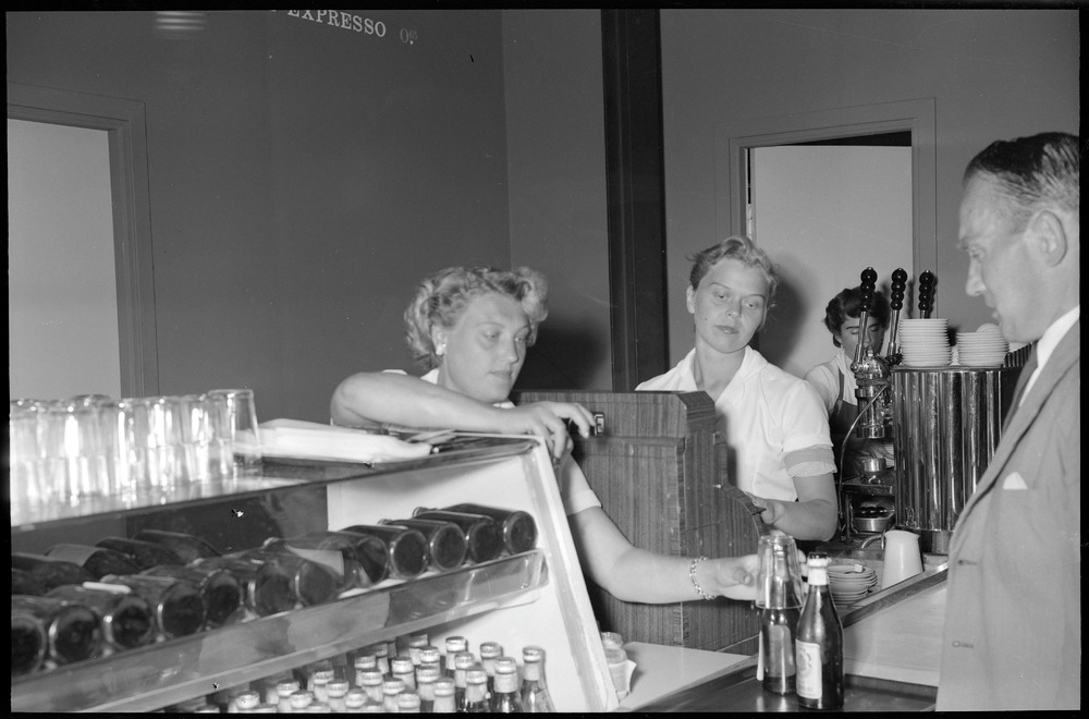 Bilden föreställer två kvinnor vid en serveringsdisk på ett café. Ena kvinnan vid en kassaapparat. En man håller på att köpa dricka.