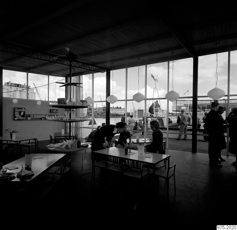 Bilden föreställer en öppen lokal möblerad som en matsal. I lokalen vistas lite människor. I bakgrunden glasfasad