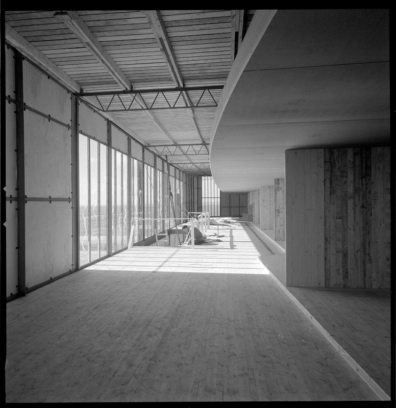 Bilden föreställer en paviljong på väg att inredas. Rakt fram lång hall, till höger moduler.