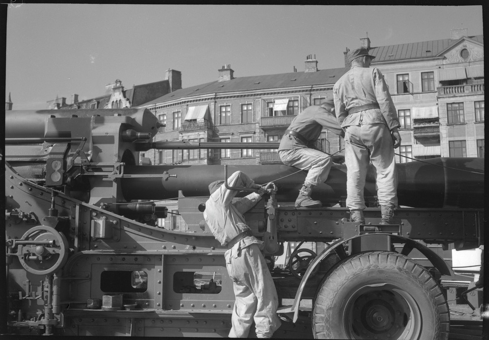 Bilden föreställer del av ett militärfordon med tre militärer på. I bakgrunden byggnader.