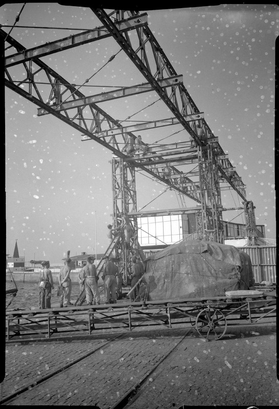 Bilden föreställer en bro under byggnation i stålkonstruktion. På marken byggnadsarbetare