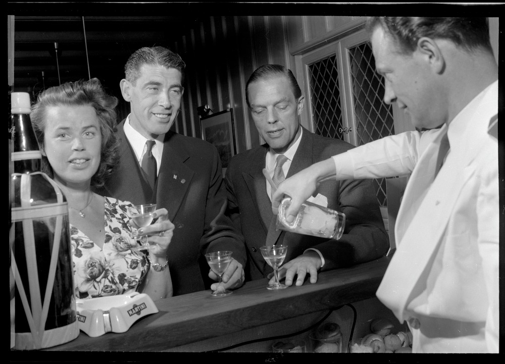 Bilden föreställer två män och en kvinna stående i en bar med varsitt vinglas och blir serverade en dryck av ytterligare en man. Alla i halvfigur.