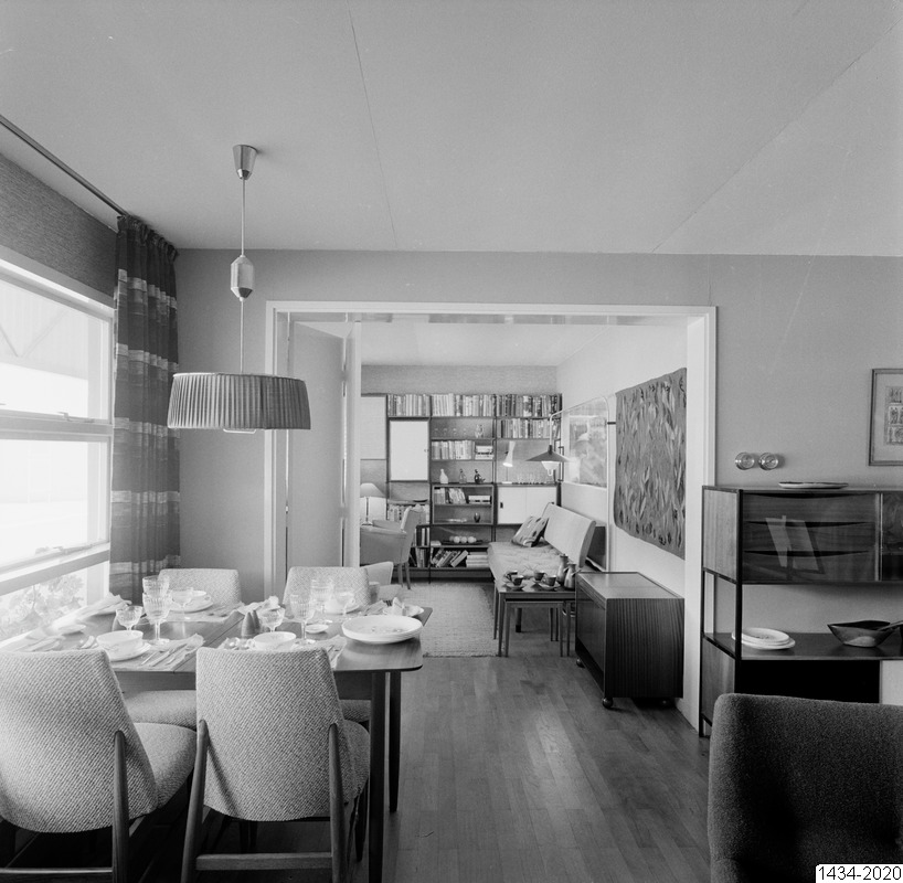 Bilden föreställer i bakgrunden vardagsrum med bokhylla, soffa och skåp. I förgrunden matbord med stolar. Bordet är dukat för måltid. Det hänger en lampa i taket.