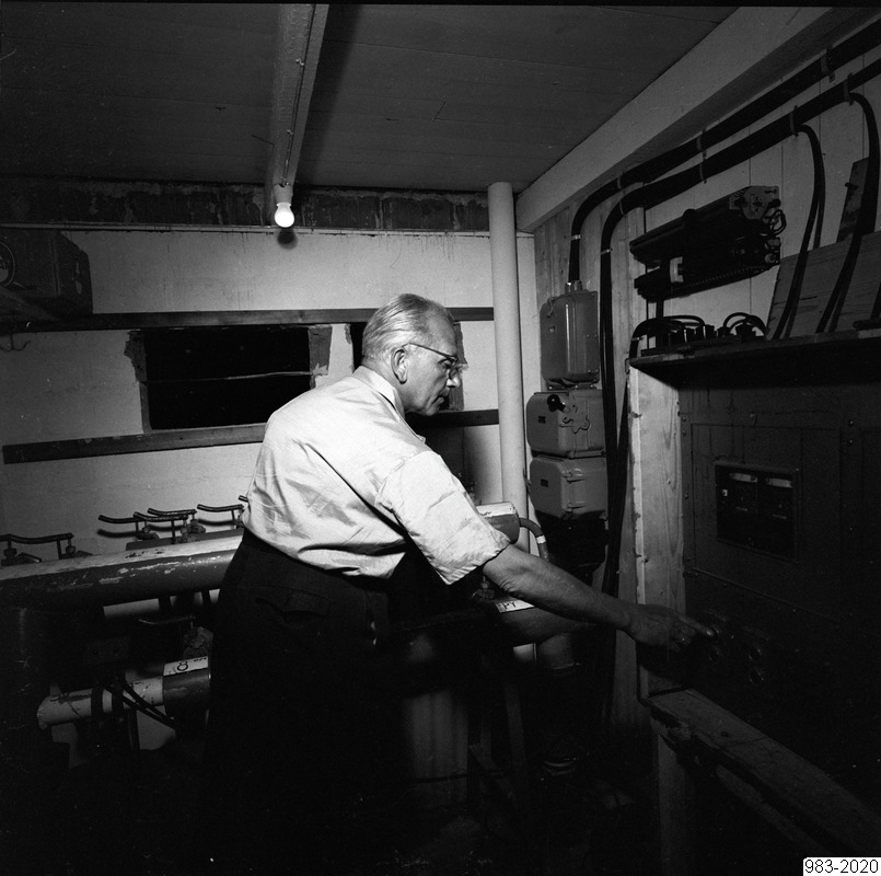 Bilden föreställer ett utrymme med ledningar. En människa syns i bilden. Någon form av elcentral eller undercentral.