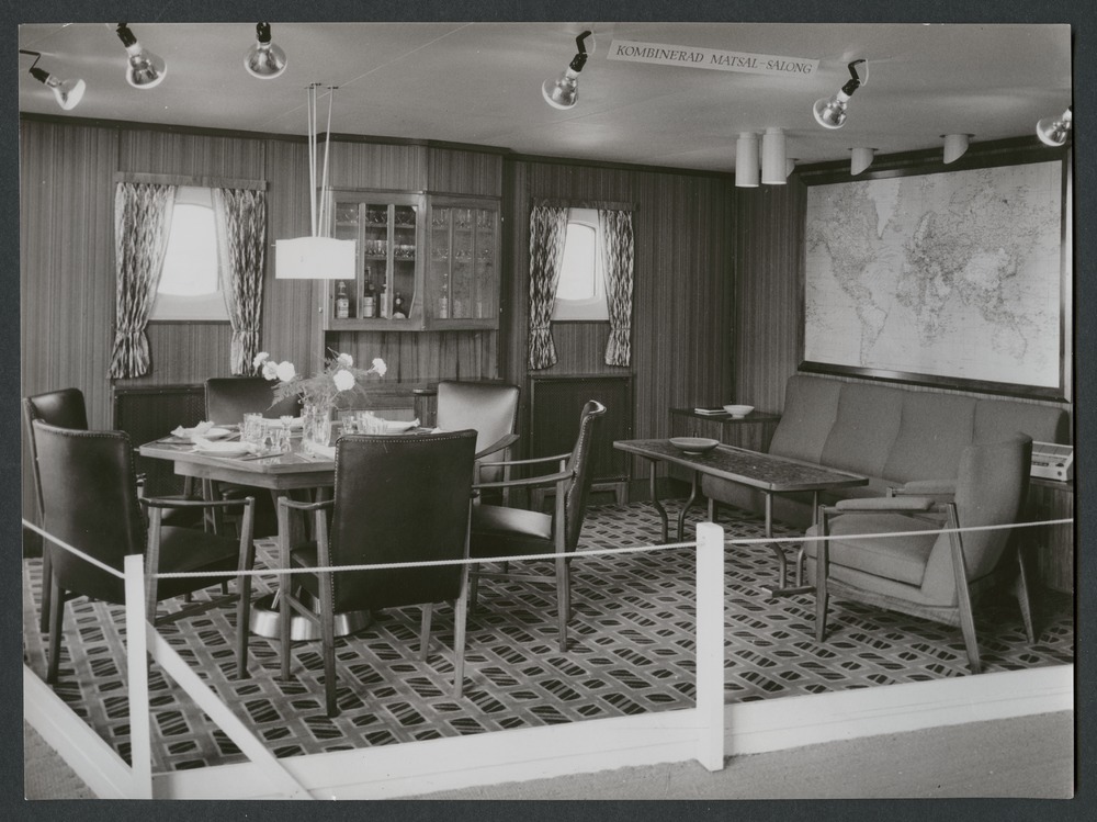 Bilden föreställer paviljongen "Ombord" , kombination matsal-salong. Foto PB. Till vänster matsalsbord med stolar och dukat för måltid. I balkgrunden hylla med vitrinskåp samt glas och flaskor. Till höger soffmöblemang med världskarta ovaför. I taket lampor, på golvet matta.