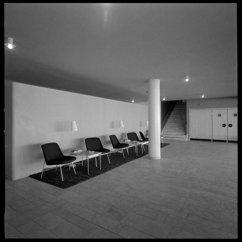 Bilden föreställer en öppen lokal. Vid den högra väggen står stolar och bord med lampor på. I bakgrunden en trappa.