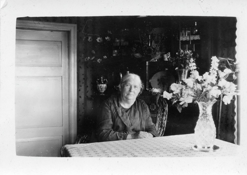Porträtt av Bengta Olsson. Bengta Olsson sitter vid ett bord med en blomvas framför sig.