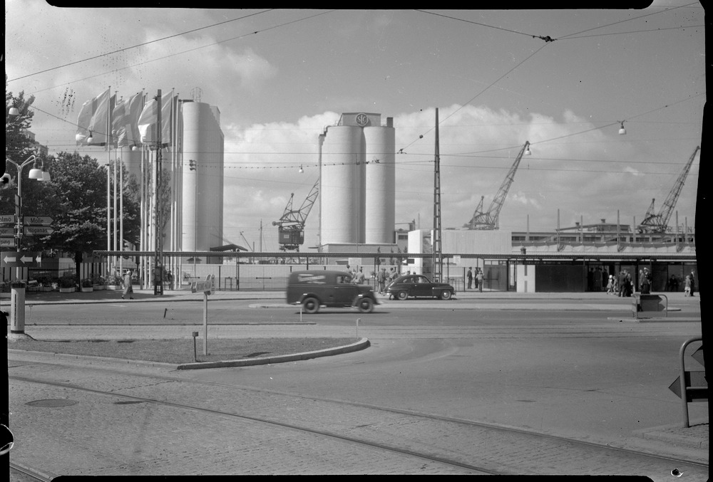 Bilden föreställer ett område med vägar och två bilar. I bakgrunden ett staket, ingång till H55 Området (?). I bakgrunden finns också flaggstänger och silobyggnader.