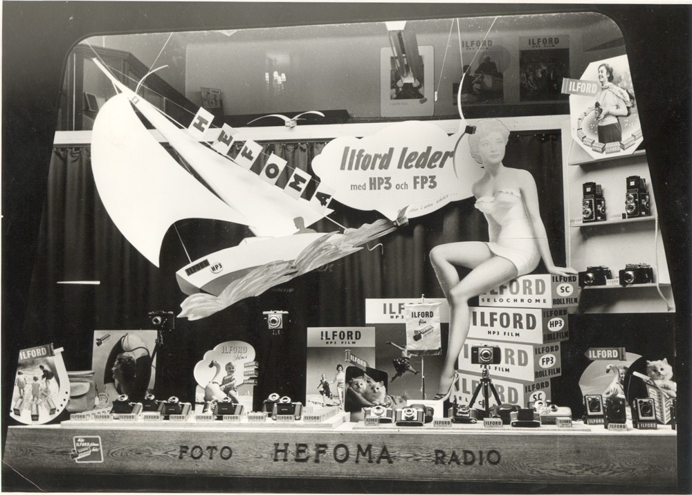 Fotografi som avbildar ett skyltfönster i Hefomas affär på Järnvägsgatan 3, i fönstret ser vi reklam för Ilford kameror. Bilden är troligen tagen på 1940 eller 1950-talet.
