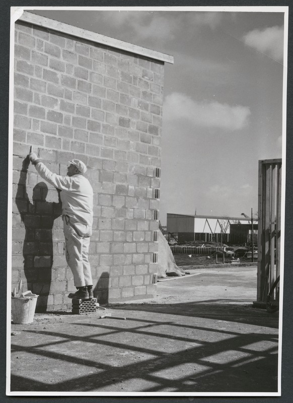 Bilden föreställer murare vid skorsten. Paviljong i bakgrunden.