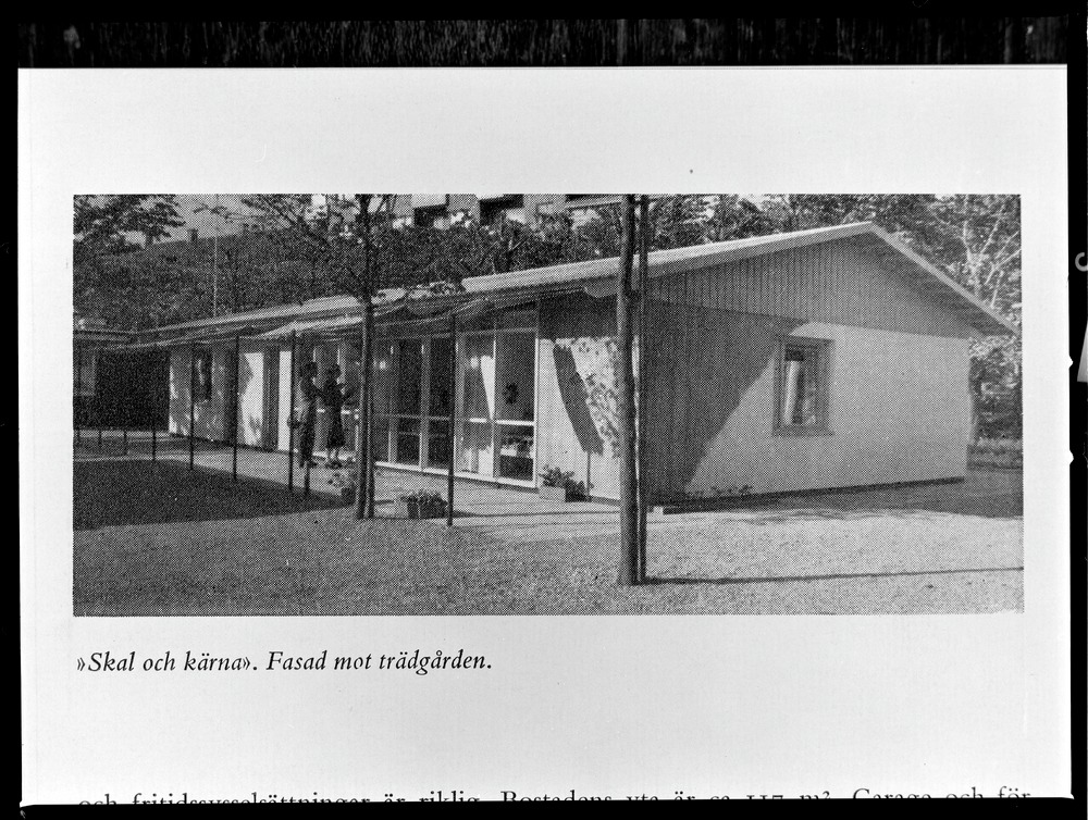 Bilden föreställer enplansbyggnad omgiven av träd och gräsmattor. text under Skal och kärna. Fasad mot trädgården