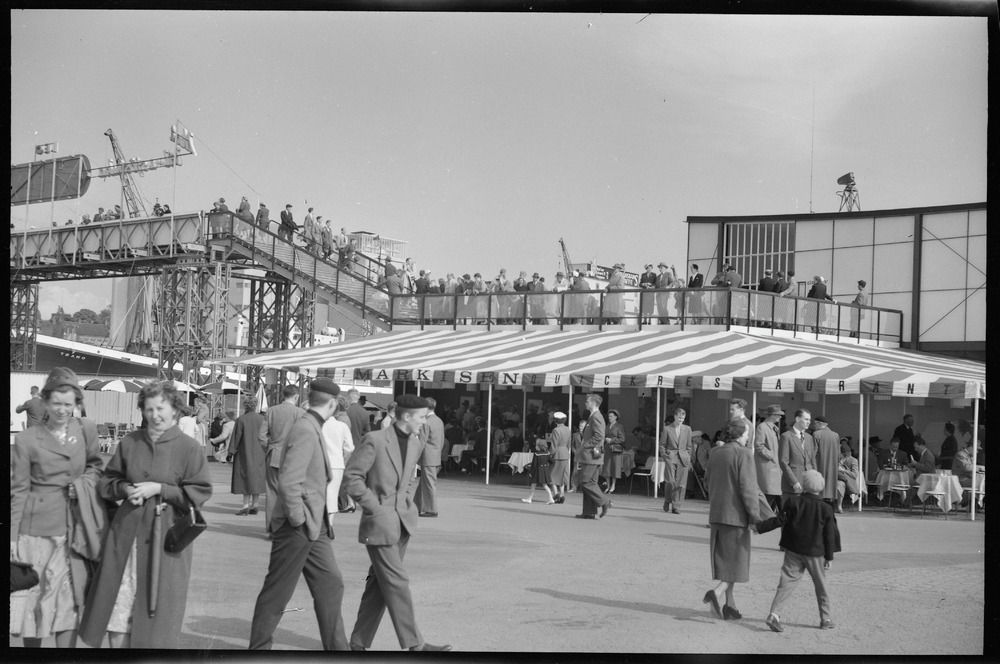 Bilden föreställer en öppen yta med flanerande människor. I bakgrunden restaurang, MARKISEN xxx rrestaurang. Där bakom gångbro och byggnad.