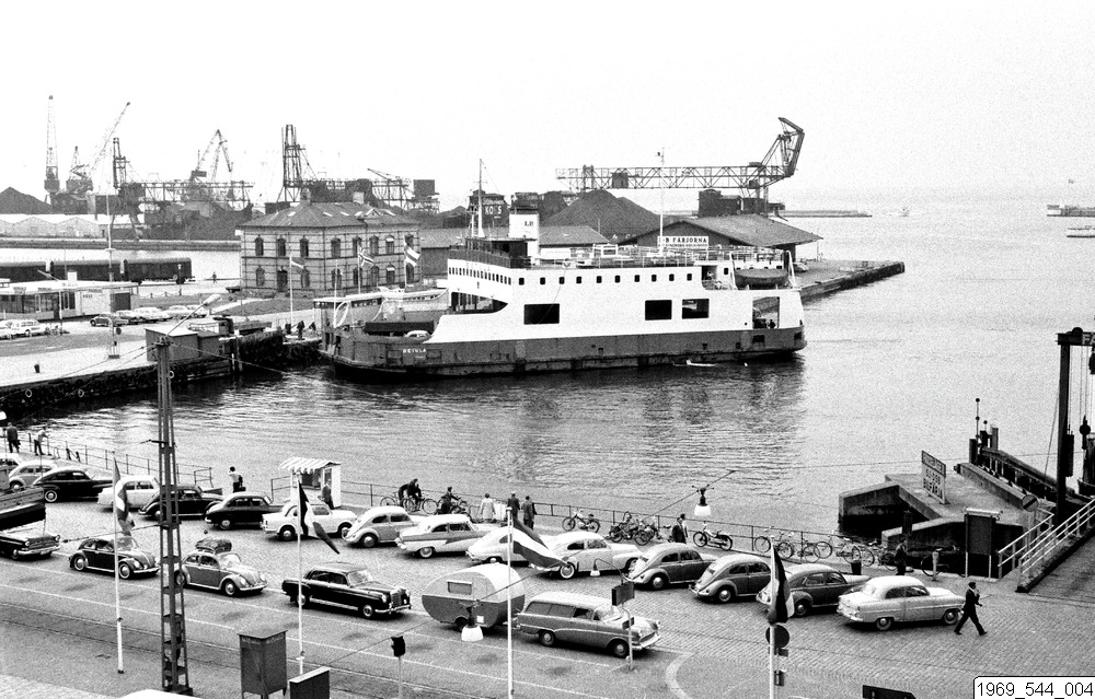 Vy över Kungstrappan mot inre hamnen. Färjan Betula syns i bild, bilar köar för att köra ombord på färja som ej är i bild.