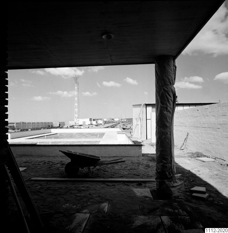 Bilden föreställer en öppen överbyggd yta med en pelare i hörnet. Till vänster husfasad till höger en mur. Mitt i bild en skottkärra. I bakgrunden byggnader.