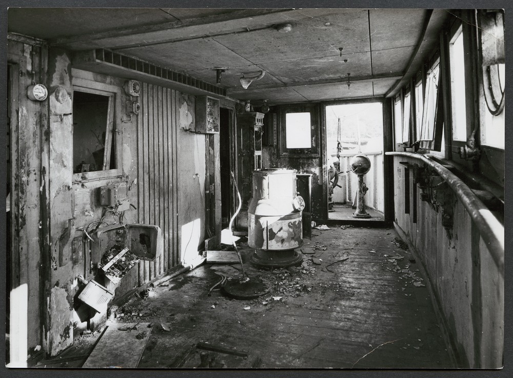brygga på fartyg, skadad och utbränd. Bilden numrerad och daterad "nr 3 2/10 - 57".