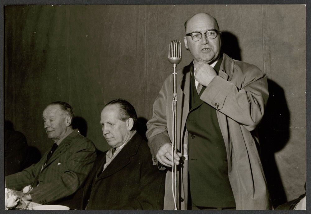 Bilden föreställer en man som talar i en mikrofon. Till vänster om honom sitter ytterligare två män.