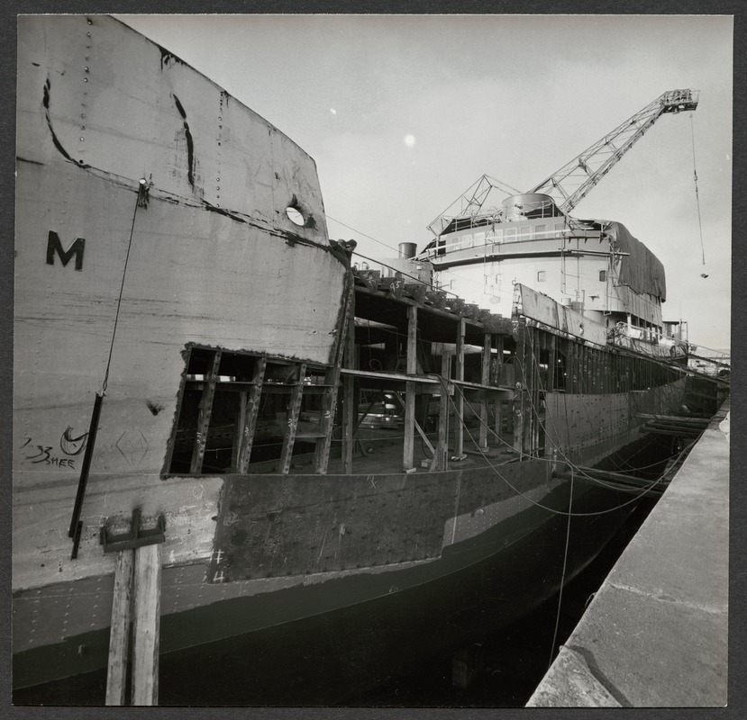 Bilden föreställer sidan på en del av ett fartyg där plåtarna är borta och man ser regelverket. I bakgrunden kommandobrygga