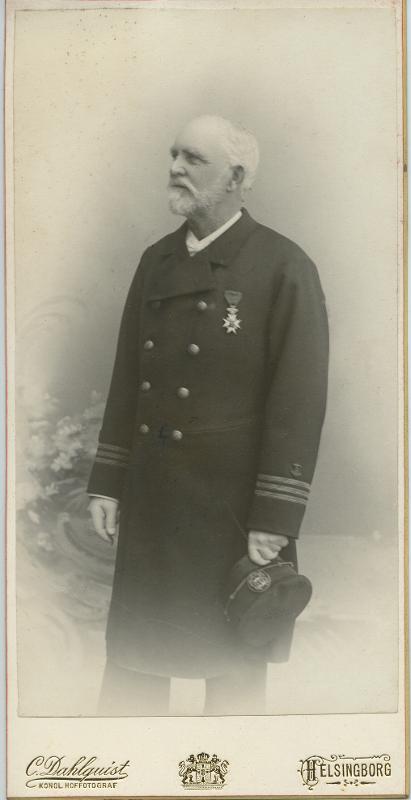 Fotografi som avbildar Frans Joseph Jeppson i sin hamnkaptens uniform med hatt och medalj. Make till Eleonora Jepson och fosterfar till Elis Wadstein.