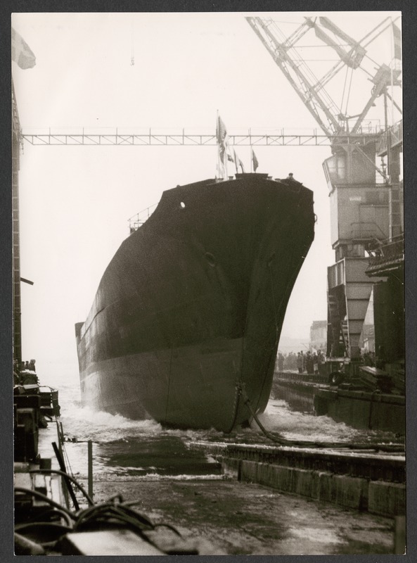 båt glider ur docka ner i hamnbassängen (eventuellt Rapid byggd 1962))