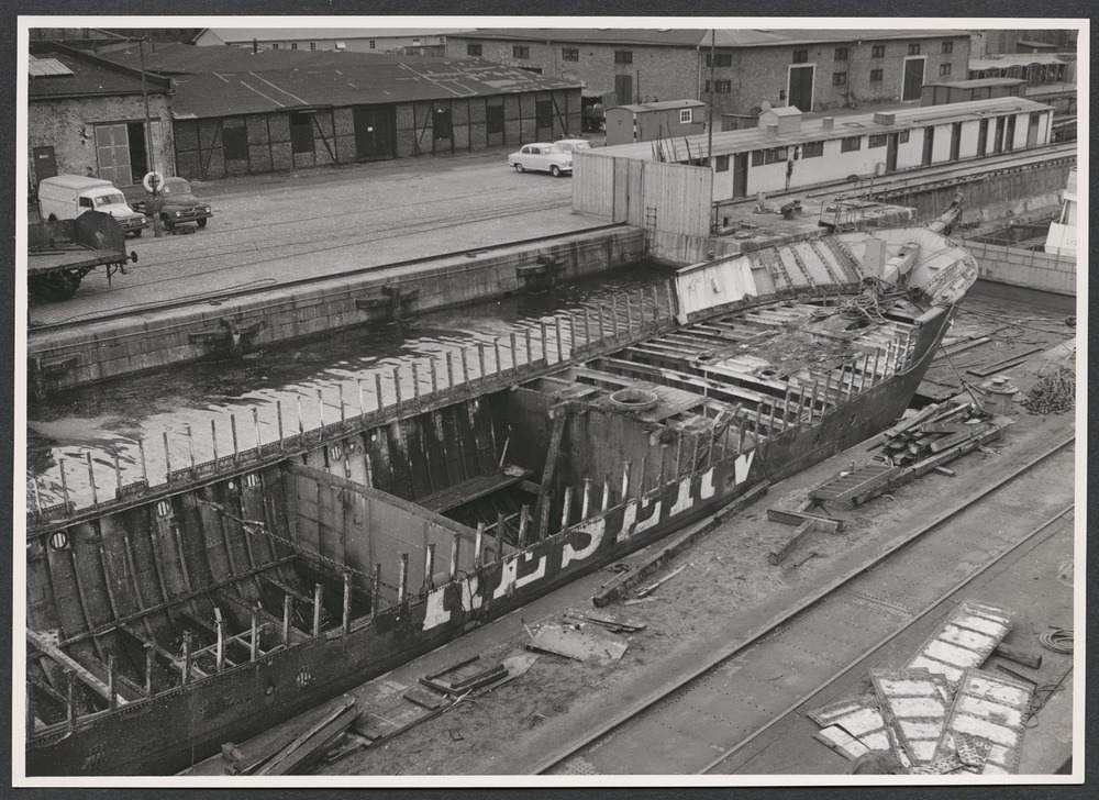 Bilden föreställer del av skalet på ett fyrskepp liggandes troligen på ett varv vid en kaj. I bakgrunden byggnader och parkerade bilar