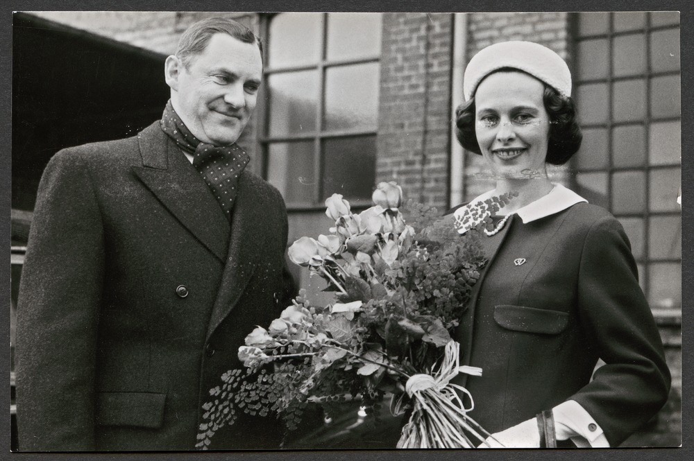 Bilden föreställer en kvinna och en man i halvformat framför tegelbyggnad med fönster. Kvinnan hållewr i en blombukett.