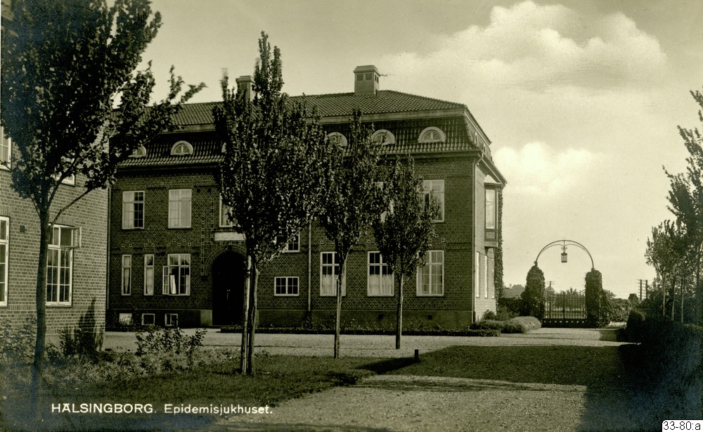 Svartvitt vykort föreställande Epidemisjukhuset i Helsingborg. På framsidan av vykortet finns tryckt, vit text: "HÄLSINGBORG. Epidemisjukhuset.". På baksidan tryckt svart text: "Killberg, Hbg N:o 12313".