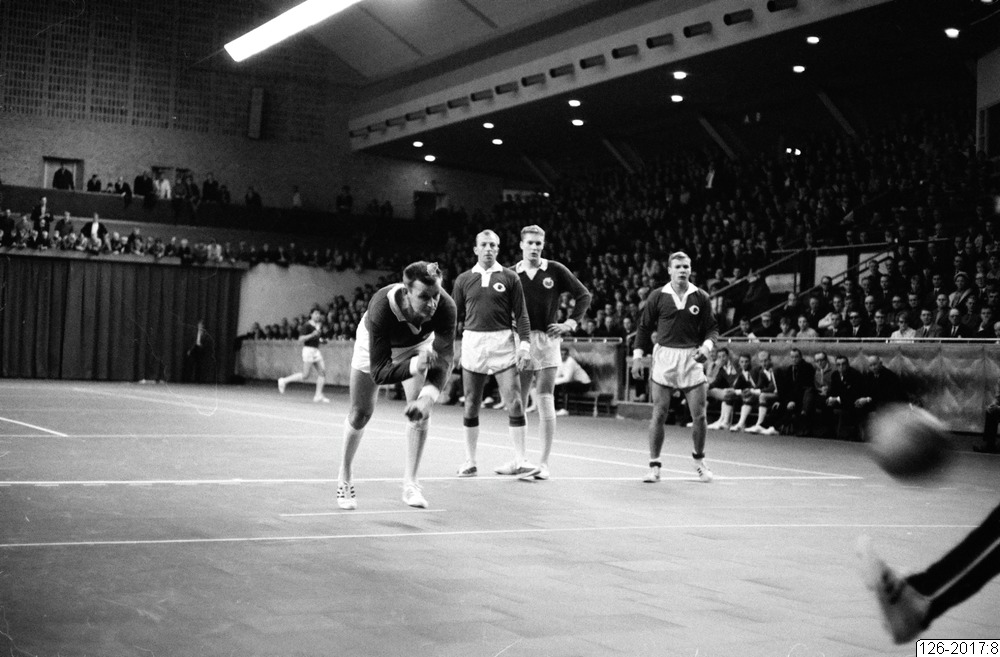 Allsvensk handboll Vikingarna-Göta. Straffläggaren är Kjell-Åke "Charlie" Pettersson. Spelarna som väntar på retur är Sven "Pidder" Pettersson, Jerry Rosengren (båda Göta) och Lars Friedvall (Vikingarna).