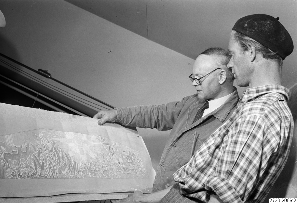 Konstnären Pär Siegård till vänster och hans medhjälpare Kaj Siesjö med en skiss till utsmyckning i en skola i Perstorp
