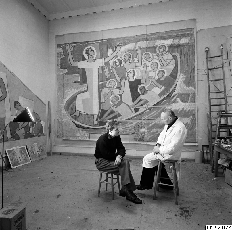Konstnär Pär Siegård i sin ateljé tillsammans med sin medhjälpare Karl Einar Andersson. Bakom dem syns "Jesus stillar stormen" som gjordes för Förslövs kyrka