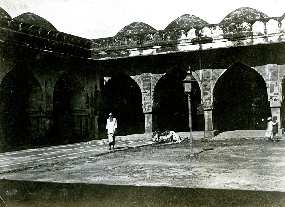 Män på tempelinnergård (I Etnografiska står det: Indien, tempel. På tempelgården synes en ärevördig(?) präst i bakgrunden en(---) som lägger upp håret på en annan höger barn. Vanadis 1884…)*