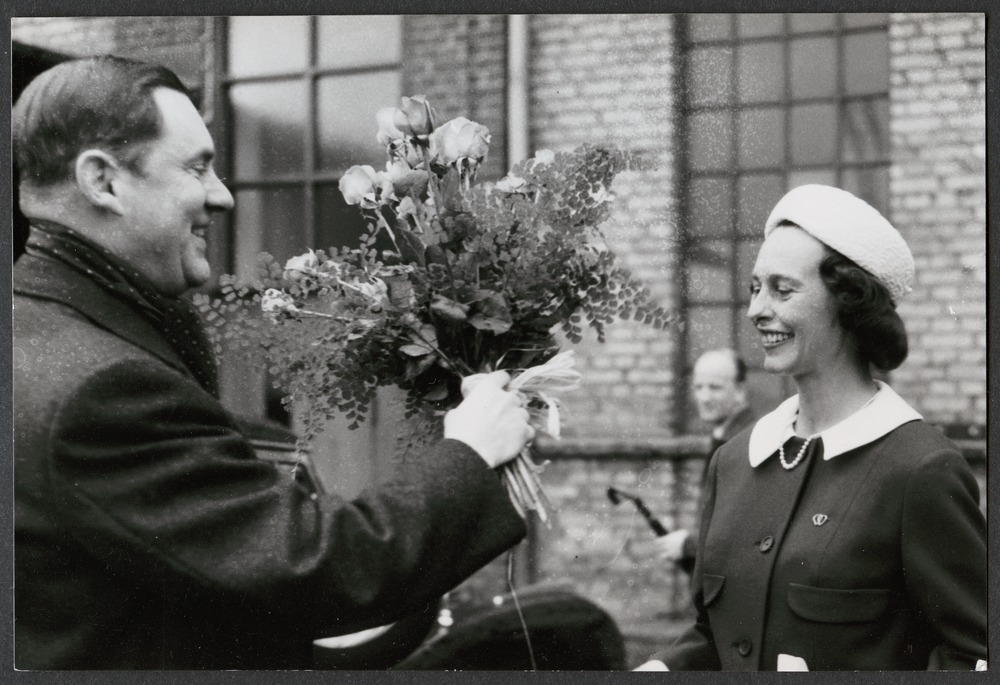 Bilden föreställer en man och en kvinna fotgraferade i bröstformat framför en tegelbyggnad. Mannen räcker över en bukett blommor till kvinnan.