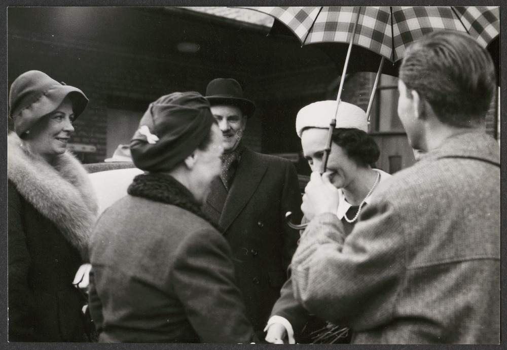 Bilden föreställer en liten grupp män och kvinnor i rock och hatt framför tegelbyggnad. Personerna är i halvformat, en har paraply
