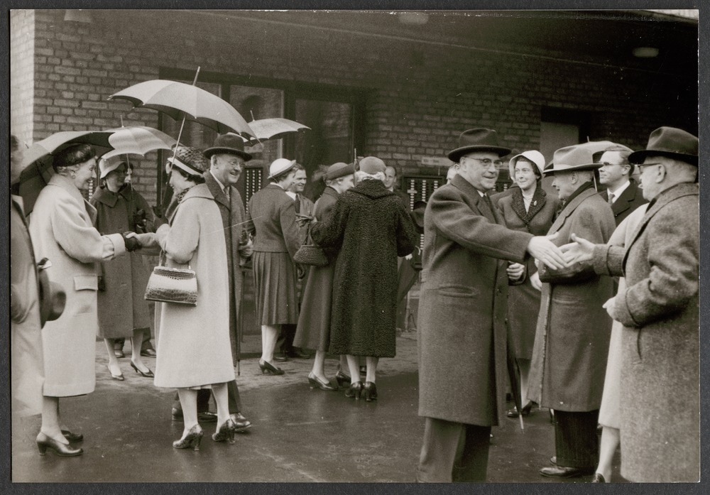 Bilden föreställer en folksamling framför en tegelbyggnad. Några av kvinnorna bär paraply och alla är klädda i rock och hatt.