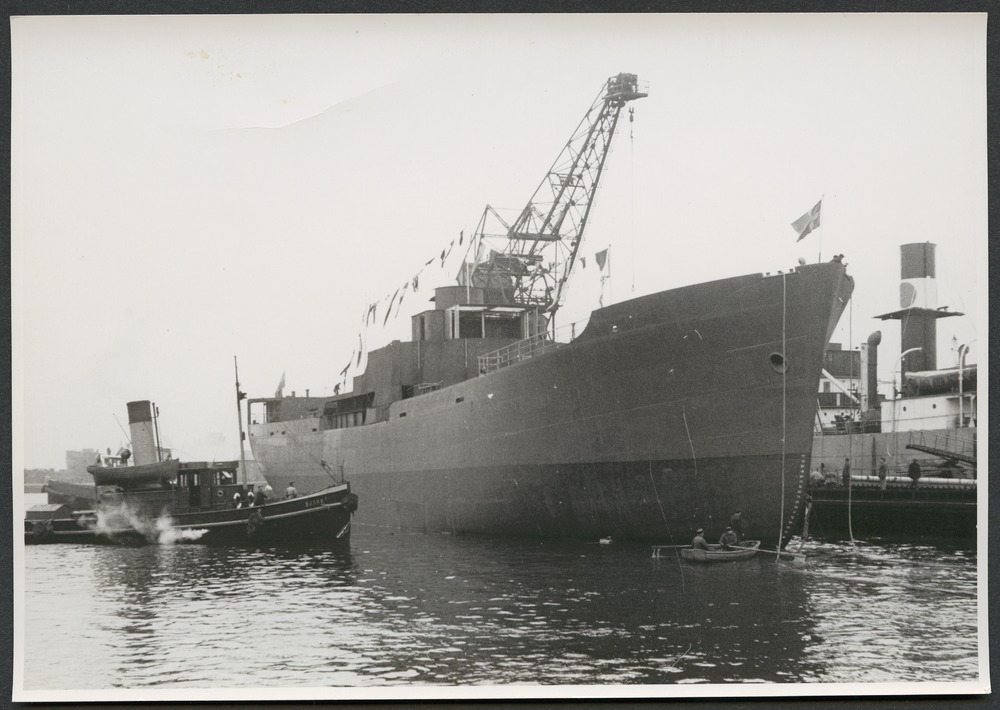 Bilden föreställer ett fartyg med vimplar i en hamn. En mindre båt ligger intill.