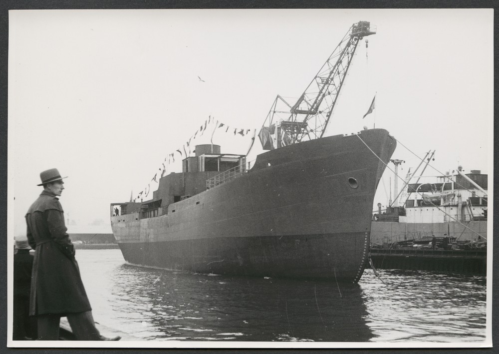 Bilden föreställer ett fartyg med vimplar ii en hamn. En man står på kajen.