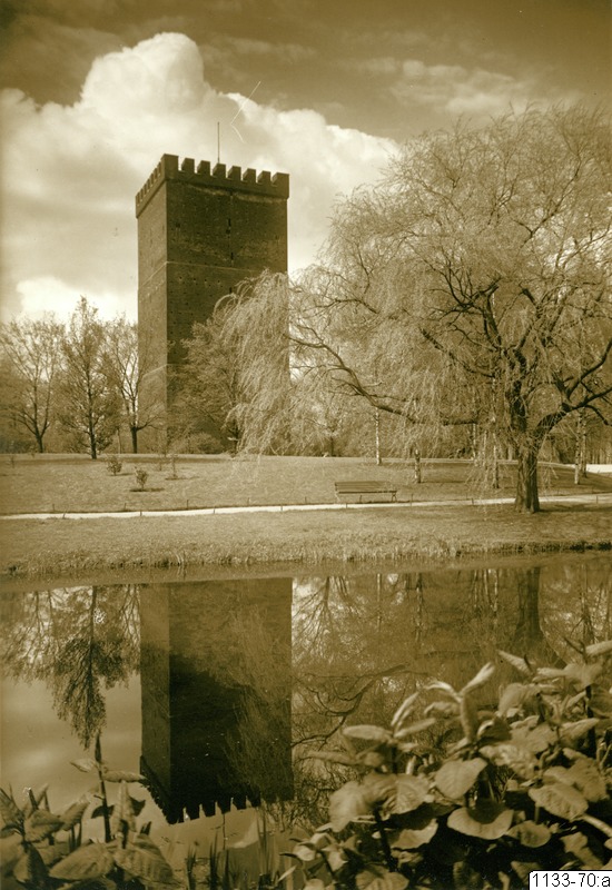 Svartvitt, sepiatonat fotografi av Kärnan med dammen i Slottshagen i förgrunden. Bilden är monterad på ljus papp.