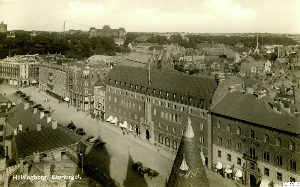 Svartvitt vykort föreställande Stortorget i Helsingborg sett från ovan. Bilden är tagen mot sydöst, från Rådhusets torn. På framsidan av vykortet finns tryckt, vit text: "Hälsingborg. Stortorget.". På baksidan tryckt, svart text: "Killberg, Hbg N:o 12353".