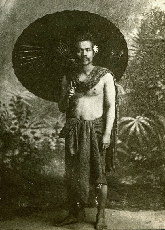 Helfigursporträtt av japan klädd i höftskynke och med parasoll