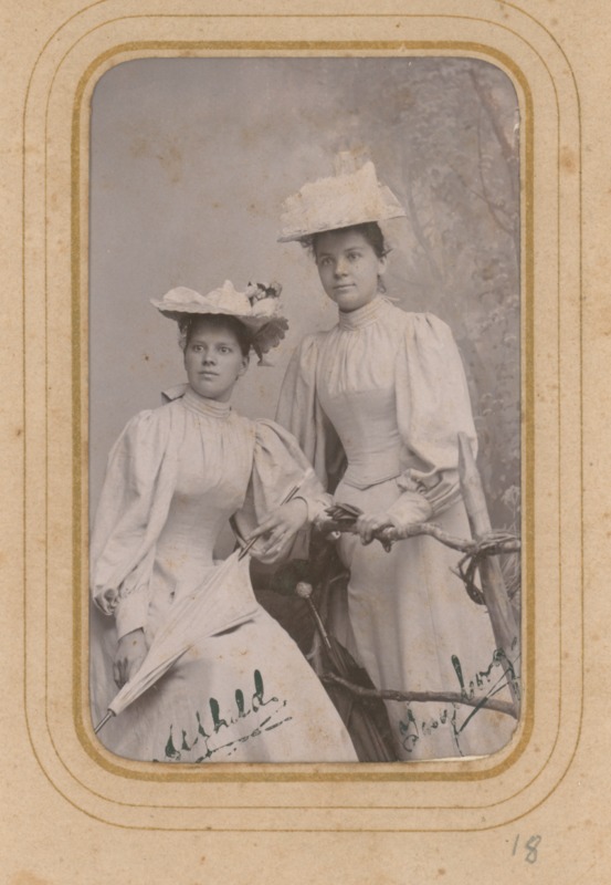 Porträtt på Alfhild Elisabeth Sofia och Ingeborg Christina Ulrika Dorothea Korler. Systrarna är klädda i ljusa klänningar och hattar.