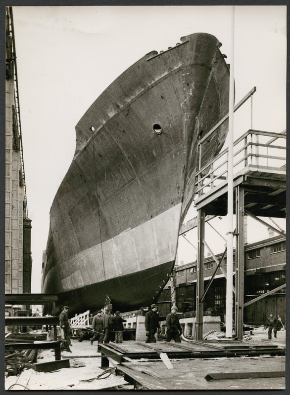 Bilden föreställer ett fartyg på ett varv sett från fören. I förgrunden varvsarbetare.
