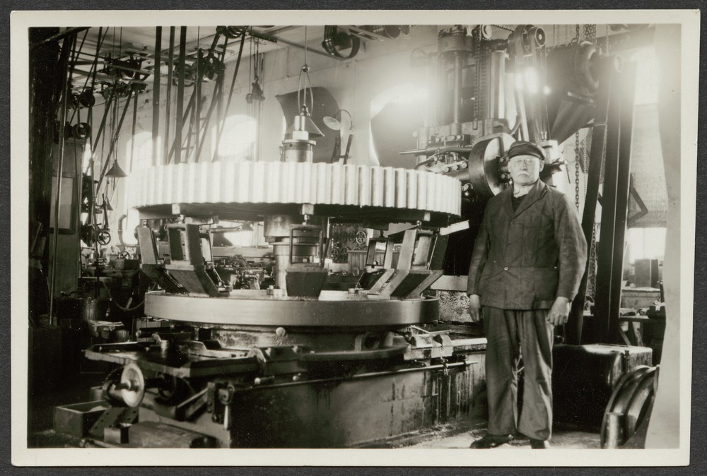foto av fartygsmaskin, tillverkad för att användas på däck eller i maskinrum på fartyg. En man står vid maskinen.
