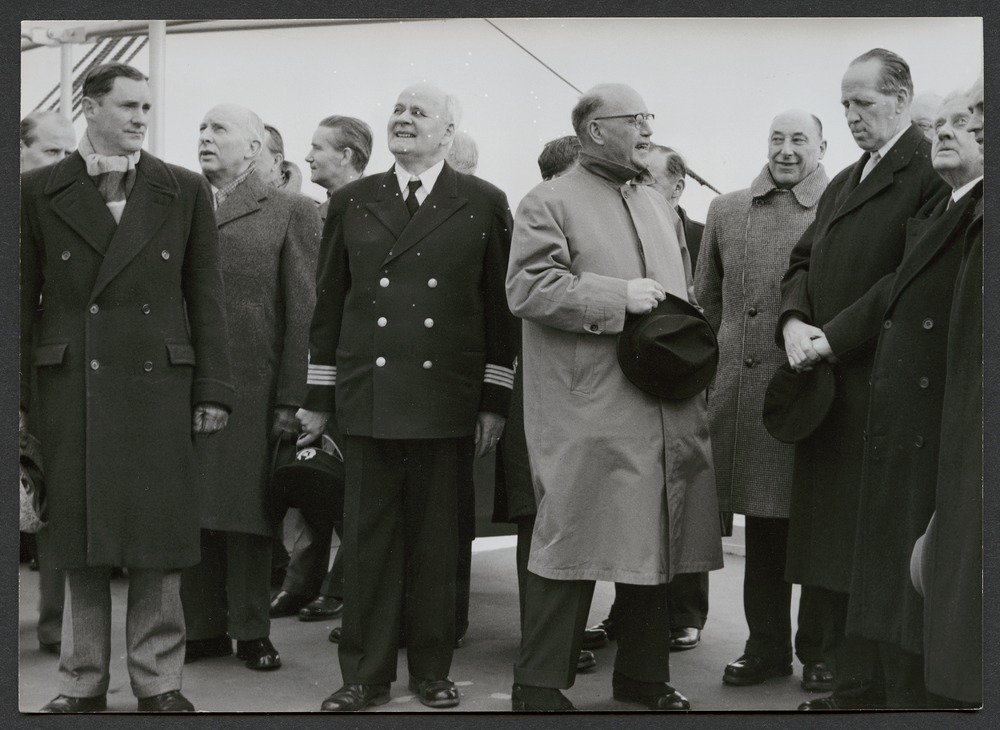 samspråkande herrar på bryggan på fartyget Inga, fler än 10 stycken, en man i uniform.