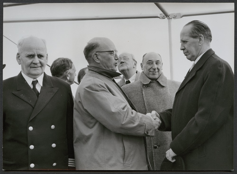 samspråkande herrar på bryggan på fartyget Inga, fler än 5 stycken.