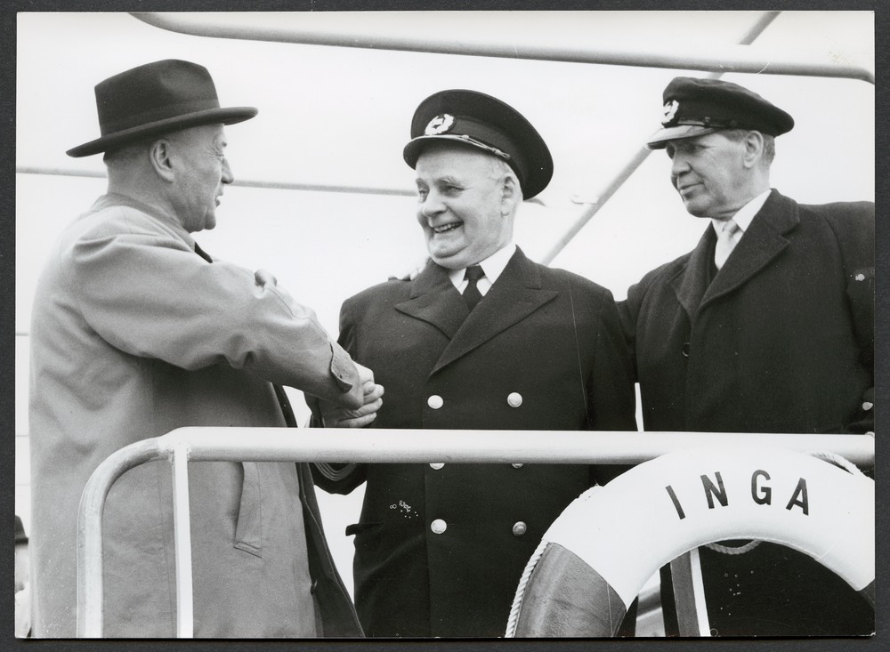 samspråkande herrar, tre på bryggan på fartyget Inga, två i uniform. Det står INGA på livbojen.
