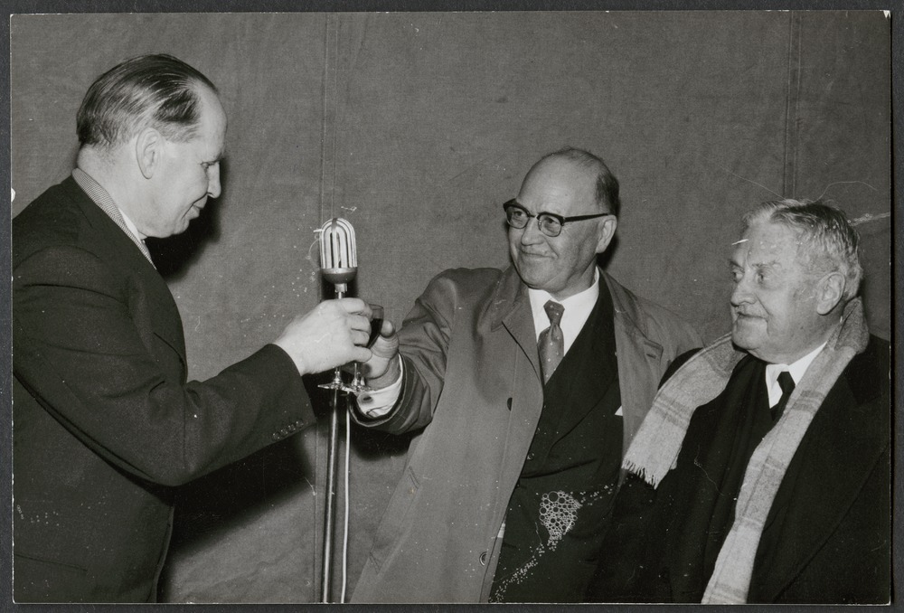från middagsbjudning, möjligen i samband med namngivning av "Inga". Tre män ståendes vid en mikrofon.