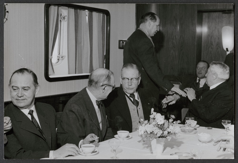 från middagsbjudning, möjligen i samband med namngivning av "Inga". Sex herrar på bild, sittandes och ståendes. På bordet kaffekoppar och glas samt blommor.