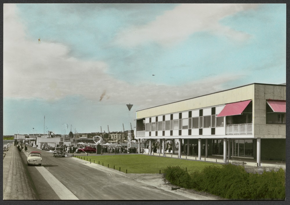 Vykort från H-55. Bilden föreställer Restaurang Pararpeten. Till vänster mur mot havet intill den bilväg med bilar. Till höger restaurang Parapeten. I bakgrunden folksamling och fler paviljonger.