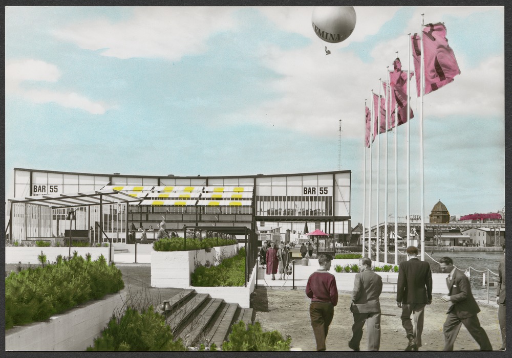 Vykort, människor på väg mot H-55 baren "bar 55". I förgrunden plantering, till höger flaggor